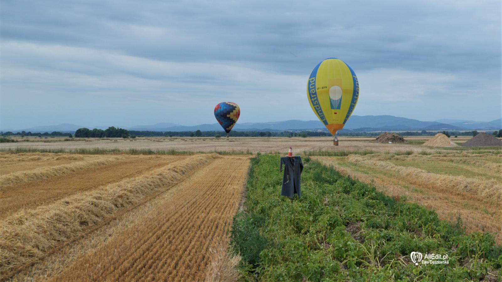 Minęliśmy z lewej strony grupę wiatraków znajdujących się nieopodal stadionu. Dalej spokojnie podążaliśmy śladem „lisa”. Ten wylądował na ściernisku. Obniżyliśmy lot, żeby jak najlepiej trafić w jego miejsce lądowania. Jednak po drodze wyrosła nam cała armia …strachów na wróble. Wyzwaniem było je ominąć nie zbaczając z kursu, a po minięciu lisa szybko wylądować, by nie zbliżyć się do granicy, a jeszcze wcześniej do wyrosłej na polu góry …gnoju. Także mimo nie tak dużej prędkości wiatru, manewry musiały być energiczne, co przy dużej masie balonu skończyło się przewrotką kosza. Ale wszystko było pod kontrolą, bezpiecznie wylądowaliśmy przed zachodem słońca w Unikowicach. Ten barwny i emocjonujący lot na pewno pozostanie w pamięci.