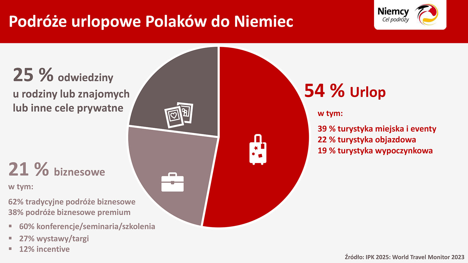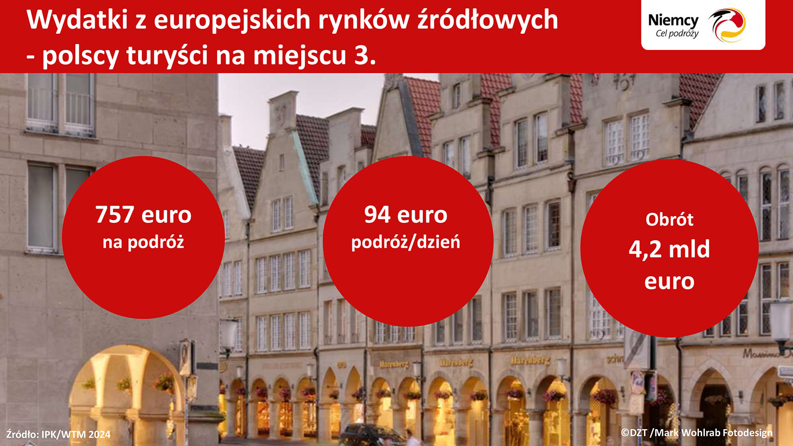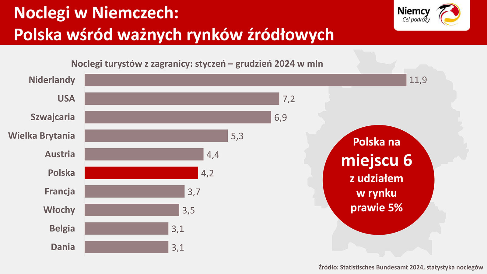 Na podstawie danych Niemieckiej Centrali Turystyki (DZT) rok 2024 zapisał się licznymi sukcesami. Jako docelowy kierunek turystyczny dla Europejczyków Niemcy zajęły 2. miejsce z liczbą 57,4 mln podróży (+7%), po Hiszpanii – 79,2 mln (+ 12%), przed Francją– 43,1 mln (+ 3%).