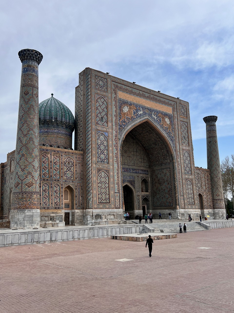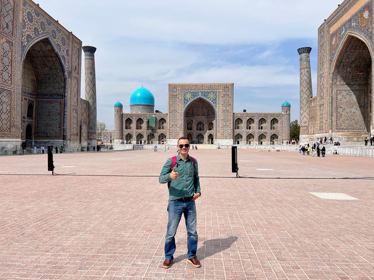 – Czyżbym wyklikał jakieś stare i nieaktualne zdjęcia głównego zabytku perły Azji centralnej i całej arabskiej architektury…? Nieeee, to niemożliwe! – Z pomocą przyszedł policjant, który zagadał mnie skąd jestem i co robię na bazarze. Po krótkiej rozmowie okazało się że Bibi-Khanym jest zupełnie inną budowlą i do słynnych samarkandzkich madras, dzieli mnie jeszcze kilometrowy spacer. Dodał, że nie muszę się martwić, bo w tym mieście wszystkie drogi prowadzą na plac Registan. Podekscytowany pobiegłem więc i faktycznie po paru minutach stanąłem przed monumentalnymi budowlami. Tego nie da się chyba opisać. Wysokie na 17 metrów trzy madresy – Uług Bek (wybudowana w latach 1417-1420), Szir Dar i Tillja Kari były pokryte terakotowymi niebieskimi kafelkami i zapierały duch w piersiach. „Och, cud! Jej masa, jak góra, stoi mocno, podpierając niebo. Majestatyczna fasada na wysokości jest podwojeniem nieba, od ciężaru grzbietu ziemi drży” – przypomniały mi się wyczytane w domu przed wyjazdem słowa ze starego tadżyckiego wersetu, które zgodnie z odczuwanym przez mnie w tej właśnie chwili wrażeniem podkreślały skalę każdej z nich. I nie sposób nie zgodzić się z takim opisem.