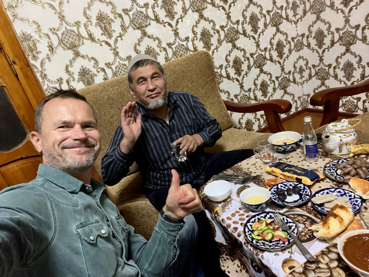 – Nie ma problemu. My mamy teraz ramadan i przed wschodem słońca siadamy do śniadania, mogę więc po Ciebie przyjechać. Jak tylko wylądujesz, to zadzwoń lub napisz i za chwilę przyjadę – napisał na WhatsApp, wprawiając mnie w błogie poczucie spokojnego rozpoczęcia podróży a co jeszcze ważniejsze, uwalniając myśli o super śniadaniu. Myśli, które z każdą mijającą godziną podróżowania z Polski przybierały coraz to realniejszych kształtów, zapachów i smaków. Nie mogłem się więc doczekać pysznego śniadania a pragnienie to podczas lądowania, niemalże dorównało po 20 godzinnej podróży, chęci ujrzenia na własne oczy trzech muzułmańskich madras na placu Registan. Po przejściu formalności granicznych i odpowiedzi na kilka pytań, związanych z celem przyjazdu do Uzbekistanu musiałem jeszcze rozwiązać problem telefonu. Mając zaplanowanych cztery państwa, zdecydowałem się nie kupować żadnych kart telefonicznych. Poprosiłem więc stojącą, na stoisku wynajmu aut, panią o pomoc w kontakcie z moim gospodarzem. Po krótkiej rozmowie pani nie tylko mi pomogła, pomimo, że wcale nie zamierzałem u niej wynająć samochodu ale i potwierdziła, że ludzie z reguły są mili i przyjaźnie nastawieni do podróżnych, oprócz wyjątków, na których skupiają się współczesne media, przedstawiając nam swoją niebezpieczną wizję świata. Miałem czekać przy wejściu głównym na lotnisko na białą Ładę i faktycznie taka po dziesięciu minutach podjechała. Bozorboj (pierwszy raz usłyszałem takie imię) okazał się starszym, 68 ośmioletnim muzułmaninem z długą brodą. Ubrany był w tradycyjną męską galabiję (z arabskiego dżalabiję), długą luźną szatę noszoną przez arabskich mężczyzn. Gdybym nie znał jej z poprzednich wypraw, to mógłbym pomyśleć, że Bozorboj wskoczył do auta w piżamie, bo galabija przypomina nieco europejską koszulę nocną. Po krótkiej przejażdżce i wymianie pierwszych uprzejmości bardzo sprawnie dojechaliśmy do domu, w którym okazało się, że wszyscy mieszkańcy spali w najlepsze. Żadnych powitań więc nie było. Nie było też ani kolacji ani śniadania a gospodarz po wprowadzeniu mnie do pokoju pożegnał się, pomachał i mam wrażenie, że poszedł dalej spać. Jak miałem jednak ja zasnąć, gdy w brzuchu burczało jak na koncercie rockowym… Uratowała mnie ostatnia polska kanapka od żony, którą oszukałem żołądek.
