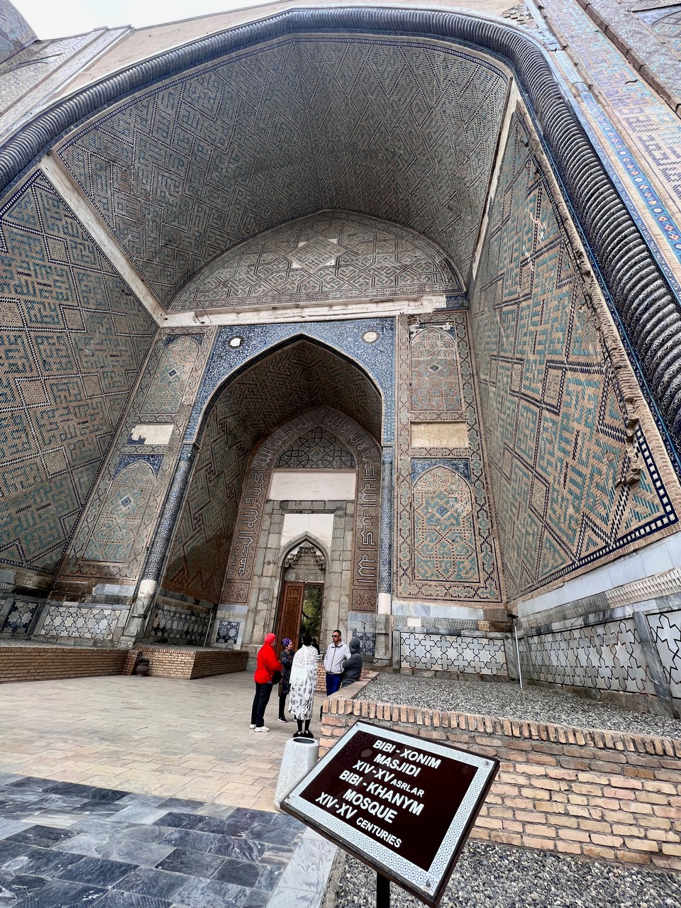 Już wybudowany przez Timura meczet Bibi-Khanym jest przykładem arabskiej megalomanii w tym przypadku wielkiego władcy, który był tak bogaty, że mógł sobie pozwolić na wszystko. Podobno środki na jego postawienie przywiózł z wyprawy do Indii, a przy budowie korzystał z ponad stu sprowadzonych specjalnie słoni. Meczet zbudowany został na cześć głównej żony Timura o imieniu Bibi. Według legendy, Bibi podczas nieobecności męża, osobiście nadzorowała wszelkie prace a ponieważ była niezwykle piękna, to jeden z architektów tak się zakochał w swojej władczyni, że nie chciał dokończyć budowy, jeśli nie będzie mógł jej pocałować. Bibi nieopatrznie, jak się póżniej okazało, zgodziła się, ale pocałunek zostawił piętno na jej policzku, który natychmiast po powrocie zauważył Timur. Architekt został skazany na śmierć, a żona musiała już do końca życia zakrywać swoją twarz. Od tamtej pory wszystkie muzułmanki mają obowiązek zakrywania się przed pożądliwym wzrokiem mężczyzn.