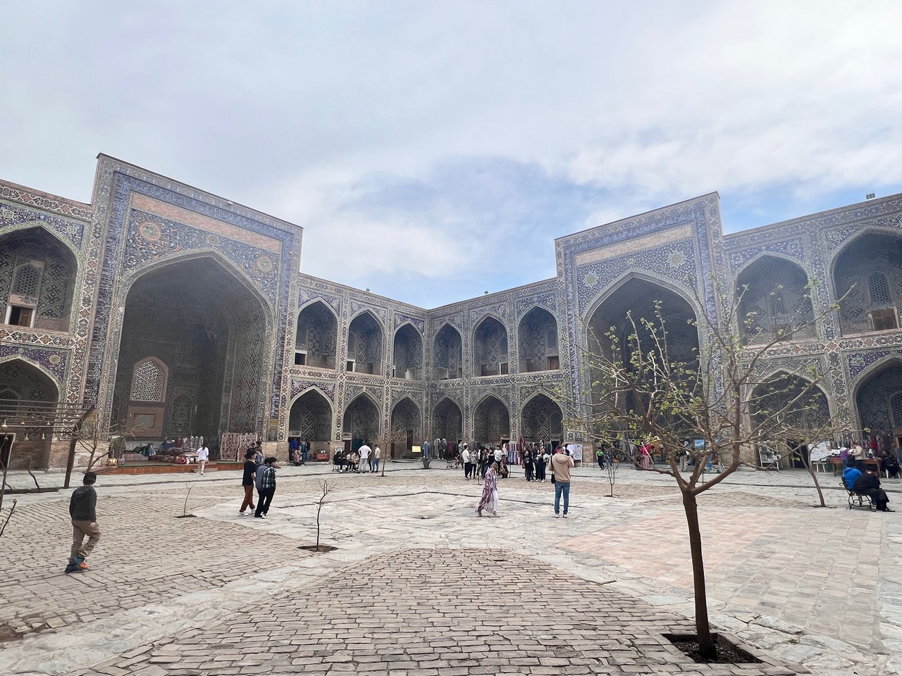 Najmłodsza madrasa Tillja Kari z połowy XVII wieku z olbrzymią kopułą i bogato złoconym wnętrzem stoi przodem do zwiedzających. Podczas wizyty warto zajrzeć na dziedzińce budynków, gdzie kiedyś działały karawanseraje (tamtejsze hotele), a dziś sprzedawane są pamiątki.