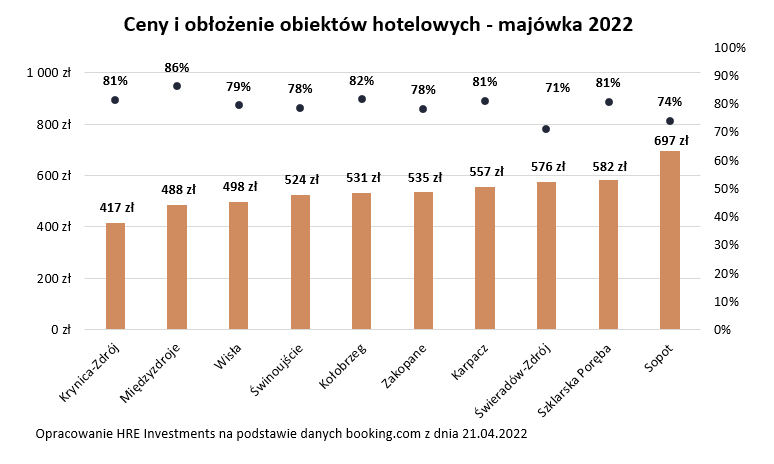 540 złotych – tyle średnio trzeba zapłacić za nocleg dla dwóch osób podczas tegorocznej majówki w 10 popularnych miejscowościach turystycznych – tak wynika z szacunków HRE Investments opartych o dane popularnego portalu rezerwacyjnego.