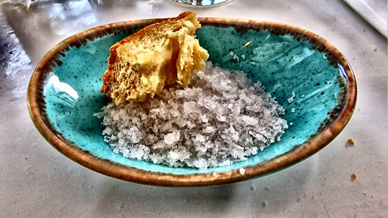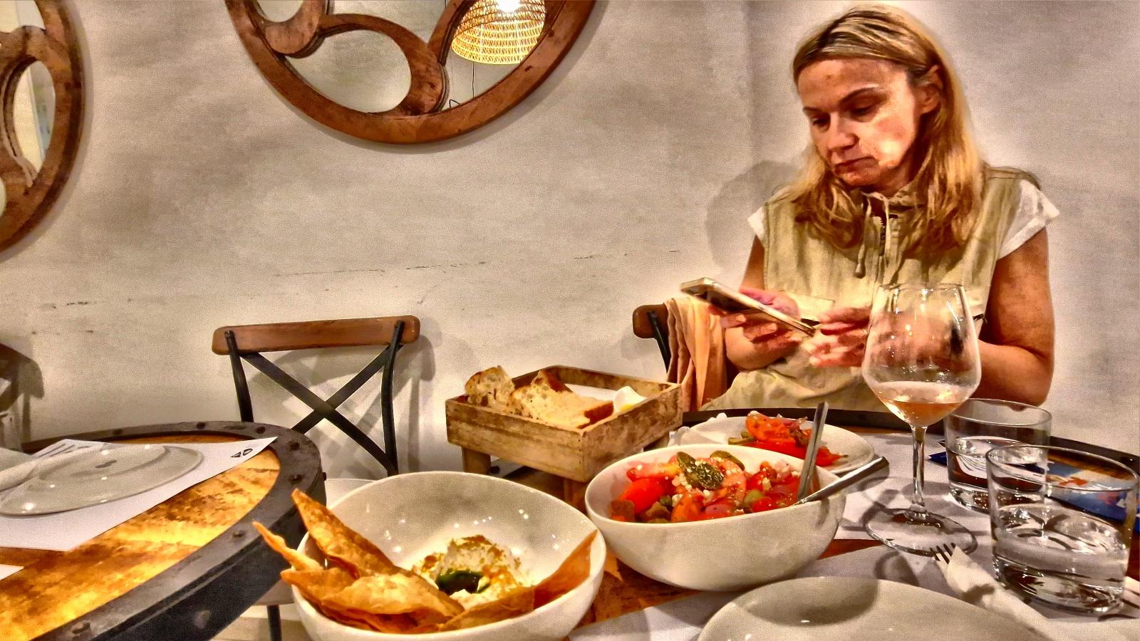 Specjalnie dla nas właścicielka restauracji, Maria, przygotowała zestaw menu złożonego z specjalności tutejszej kuchni. Na początku delektowaliśmy się świeżym domowym chlebem z lokalną oliwą z oliwek i grubą solą morską. Pysznie i prosto. Następnie dostajemy trójkątne placuszki z cukinii smażone na patelni z jogurtem ziołowym. Do tego kelnerka przynosi dużą porcję sałatki z dużych aromatycznych pomidorów, czerwonej cebuli, marynowanych ogórków, kopru morskiego z grzankami i okruszkami astypalskiego sera.