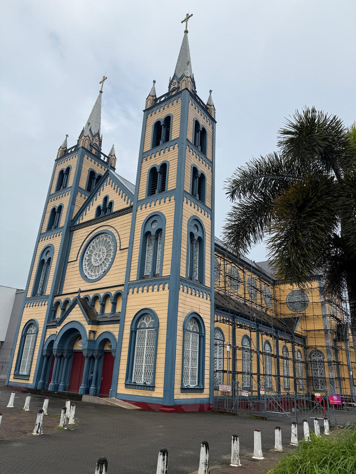 Pierwsza noc okazała się bardzo szybka…, bo zmęczony długą podróżą natychmiast zasnąłem i rano obudziłem się gotowy do zwiedzania. Hostel był położony niemalże na przeciwko katedry Piotra i Pawła, więc jakoś naturalnie w pierwszych krokach właśnie tam poszedłem. Trafiłem idealnie, bo katedra to największa drewniana świątynia na półkuli zachodniej i jeden z najważniejszych zabytków Surinamu. Zbudowana pod koniec XIX wieku, zachwyciła mnie neoromańską architekturą i pięknym wnętrzem z rzeźbionego drewna. Jej jasna, żółto-niebieska fasada i dwie strzeliste wieże są charakterystycznym punktem w panoramie miasta i co chwila mi później się ukazywały.