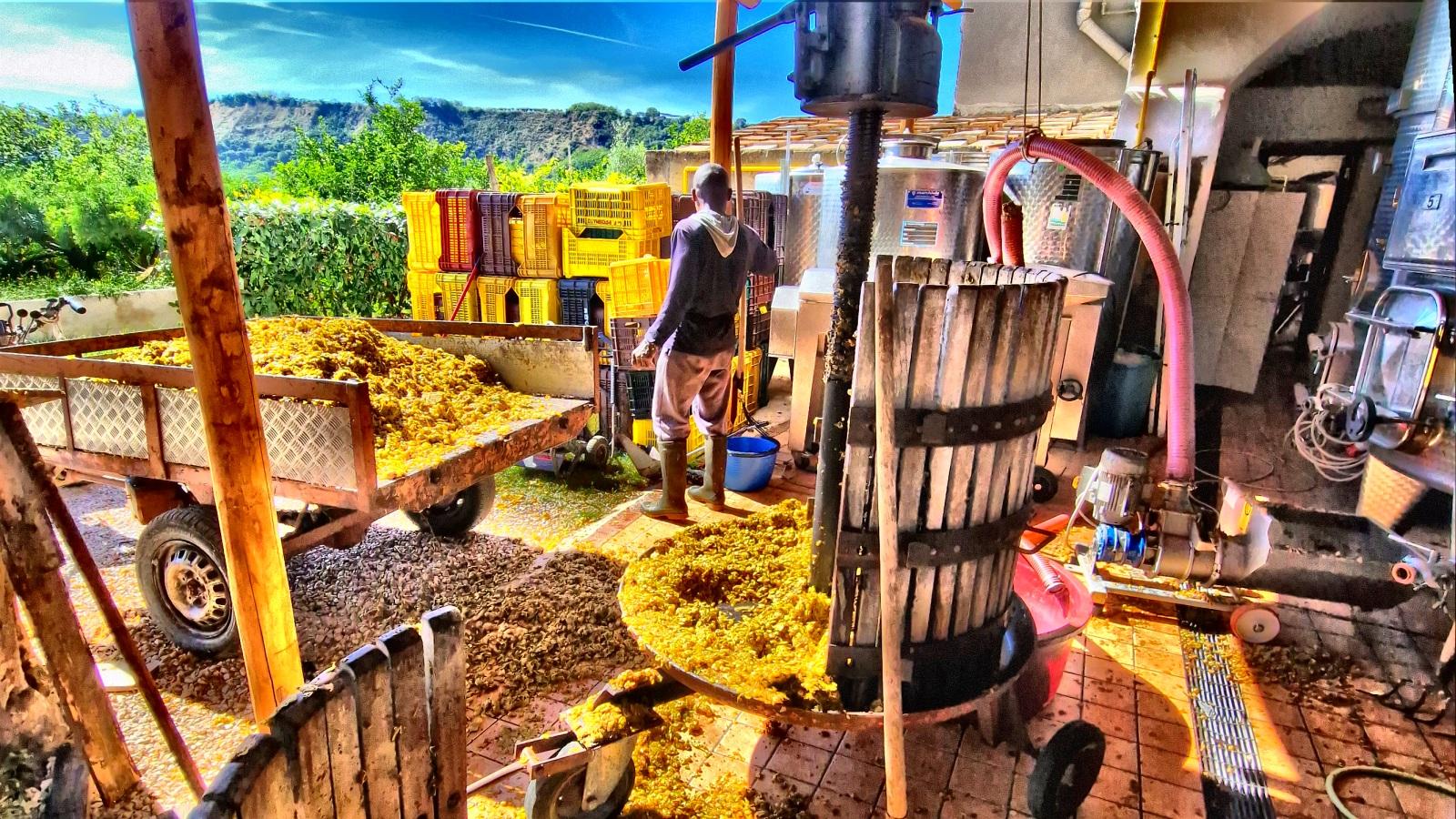 Kiedy dotarliśmy do winnicy Cantine dell’Averno, akurat zaczynał się sezon – w powietrzu unosił się zapach świeżo wyciskanego soku z winogron. Cała atmosfera była pełna energii, a wokół panowała pełna koncentracja. Winnica leży w rejonie jeziora Averno, gdzie znajduje się sporo firm związanych z winem i turystyką, z długą tradycją. Cantine dell’Averno to jedno z bardziej znanych miejsc – winnica, restauracja i agroturystyka w jednym, ulokowane na słonecznym zboczu wulkanu, z widokiem na jezioro. Wino, które tu produkują, ma wyjątkowy charakter – powstaje z winorośli odmiany Falanghina, odzyskanych z wiekowych krzewów rosnących na zboczach Averno. To miejsce nadaje winu wyraźną mineralność i głęboki smak. Czuć w nim wulkaniczną energię Campi Flegrei.