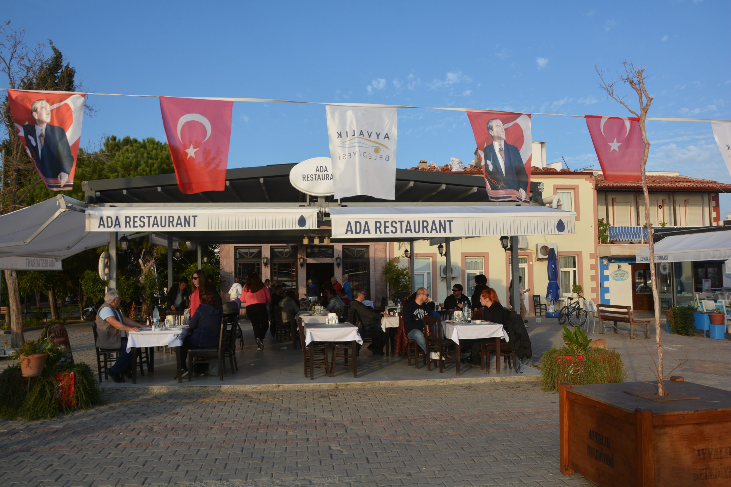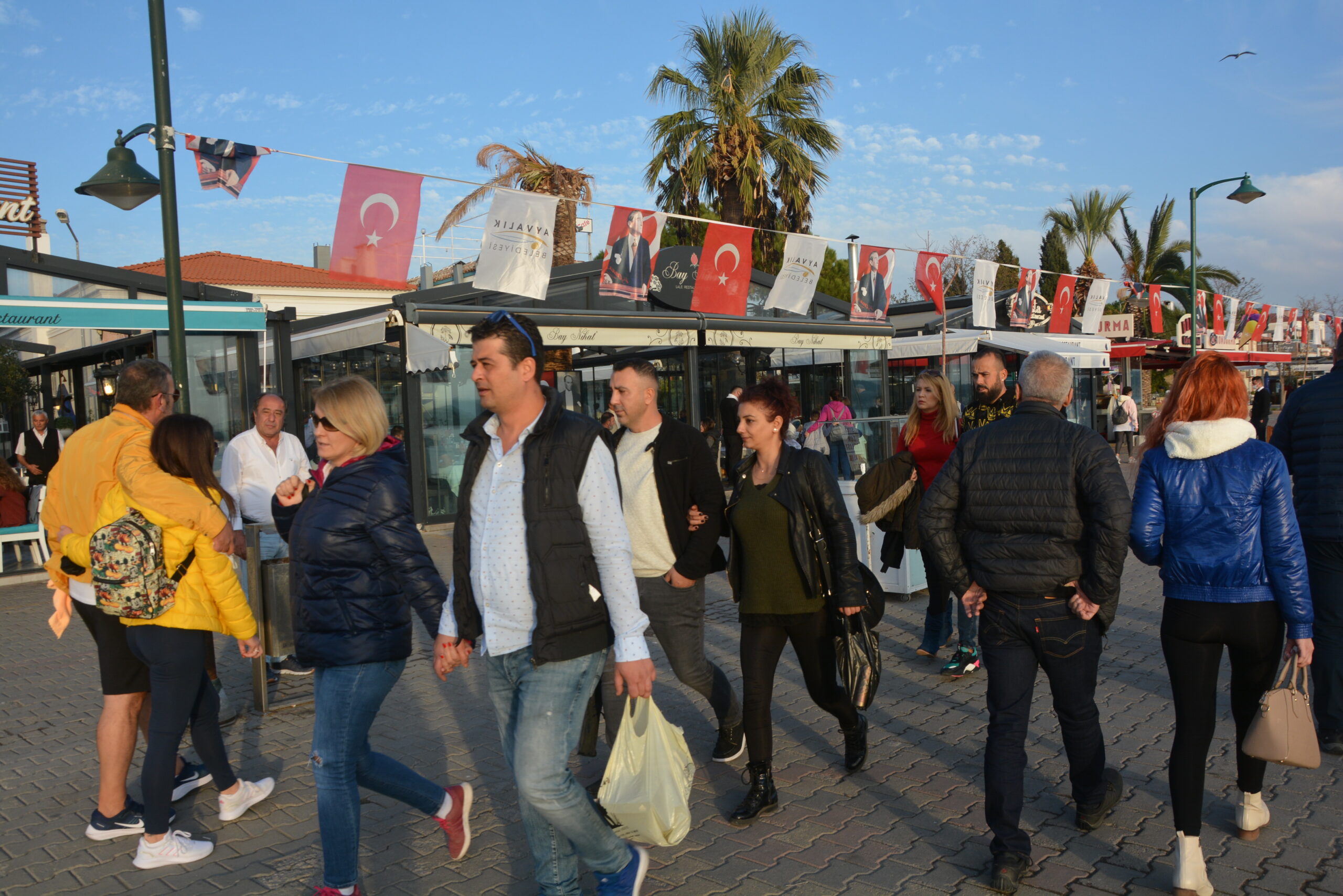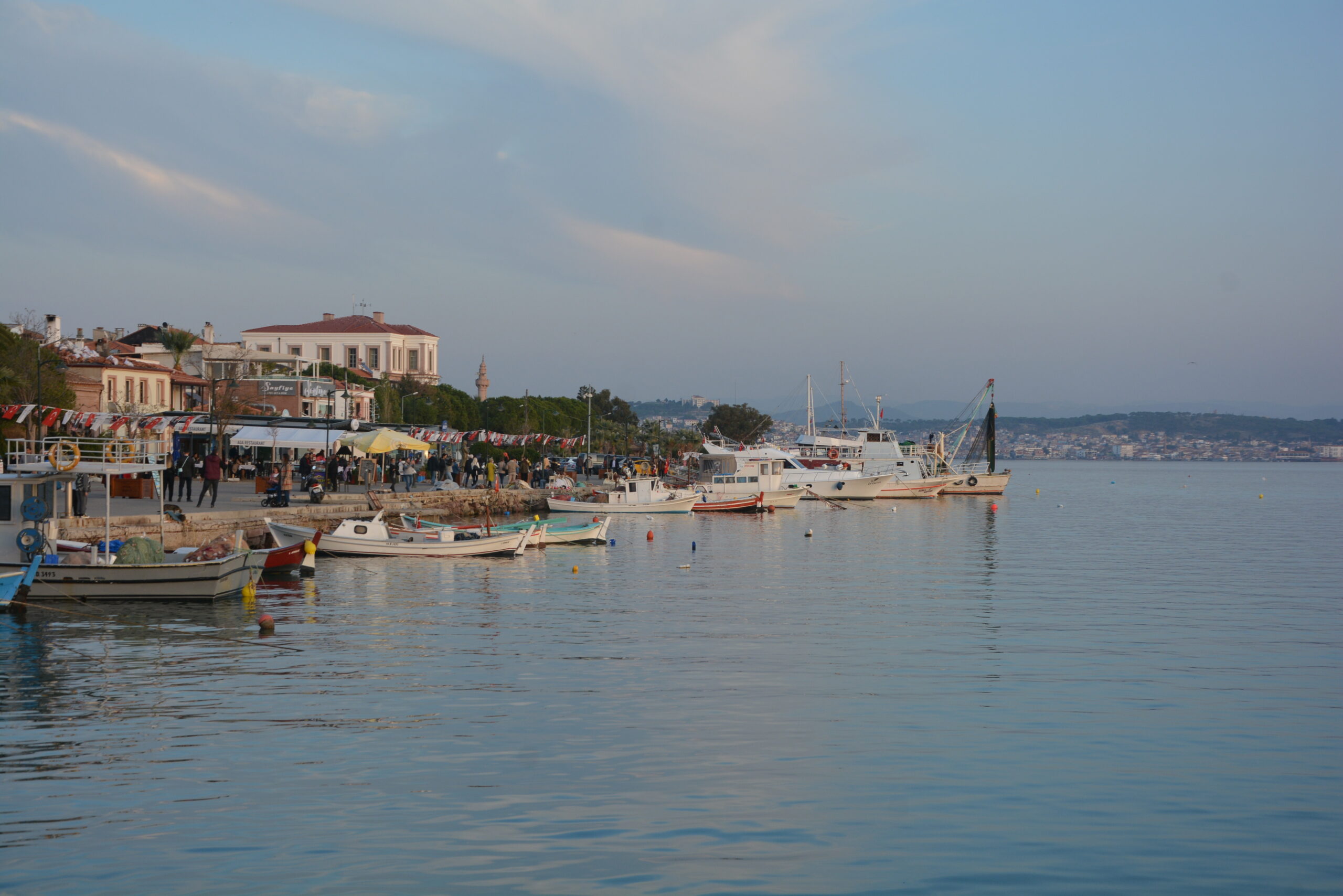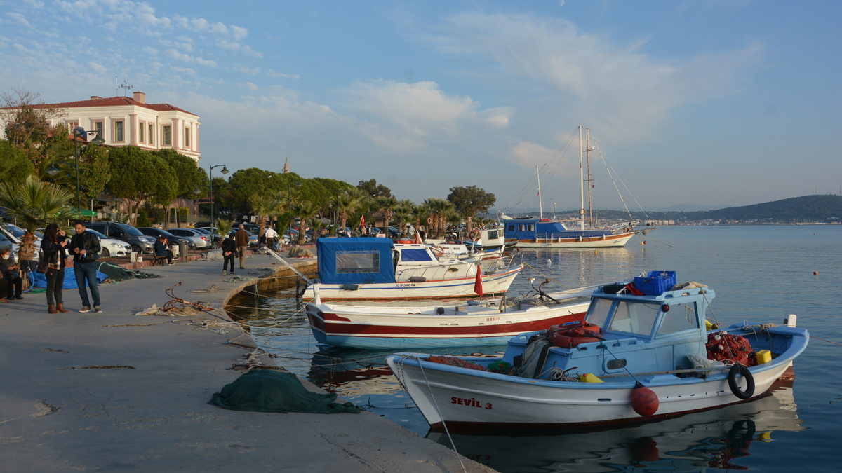 Podczas spaceru po promenadzie doszedłem do molo, znajdującego się w dalszej części portu. Cumowały przy nim większe kutry rybackie. Nieopodal była też niewielka lokalna stocznia remontowa. Oprócz rybackich łodzi w porcie kotwiczyło też kilka niewielkich stateczków wożących turystów w rejsach przybrzeżnych. Raz dziennie do molo przypływał prom samochodowy z wyspy Lesbos, która oddalona jest o zaledwie 16 km. Połączenie z tą grecką wyspą obsługuje dwóch przewoźników, a rejs trwa ok. półtorej godziny. W chwili, gdy pasażerowie opuszczali prom spokojny port momentalnie zmieniał się w gwarne i ruchliwe miejsce, a w tawernach przybywało gości.