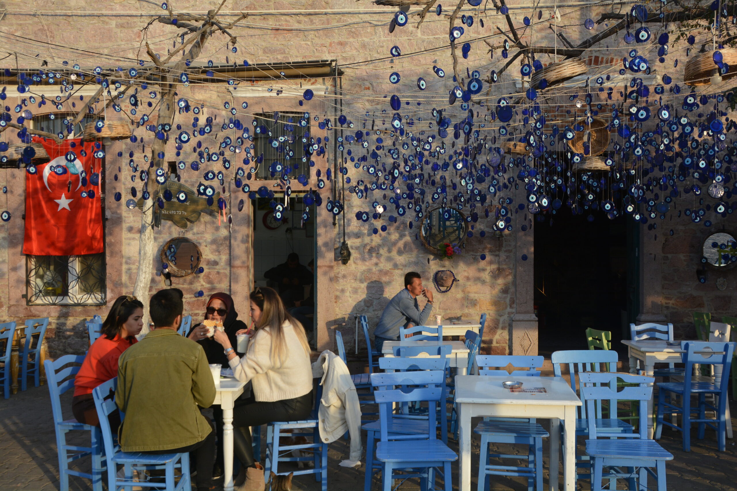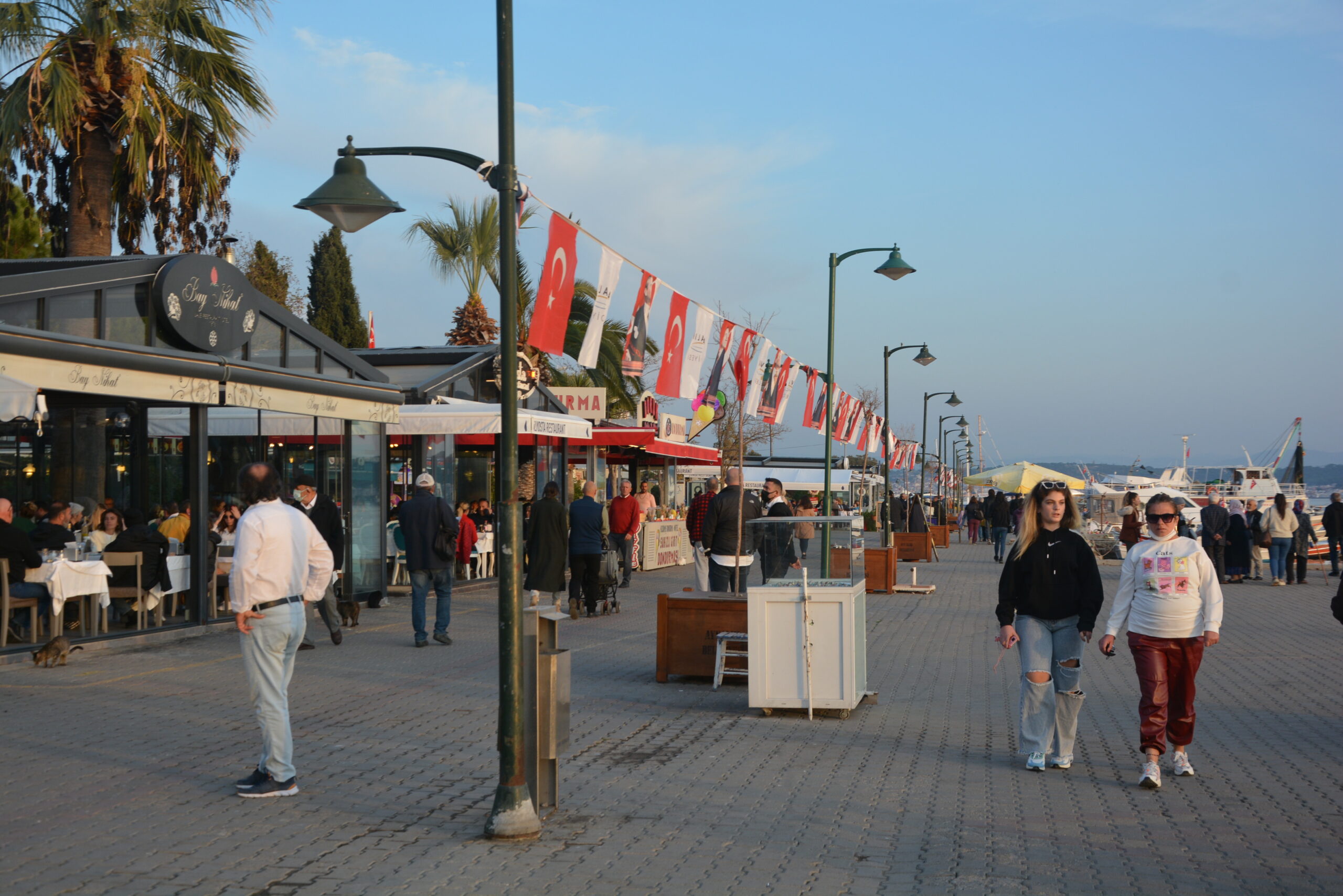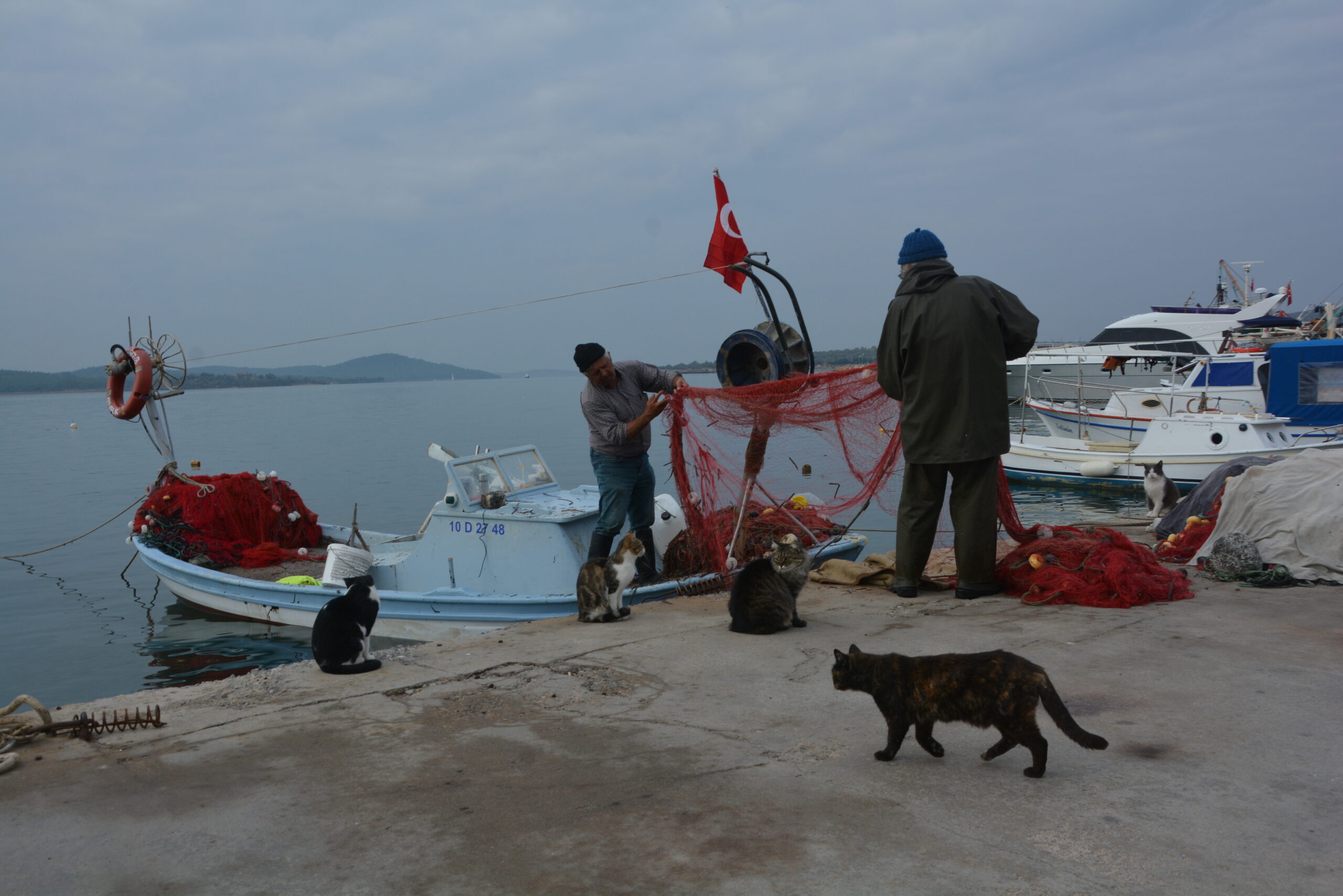 Najciekawsza część wyspy Alibey Adasi znajduje się tuż przy niewielkim porcie rybackim. W większości cumują w nim małe łodzie rybackie. To na nich miejscowi rybacy wypływają na połów na wody pobliskiej zatoki. Spacerując po nadmorskiej promenadzie, przyglądałem się pracy miejscowych rybaków, którzy po powrocie z morza wyładowywali złowioną rybę i owoce morza. W większości produkty te trafiały do pobliskich tawern usytuowanych przy nabrzeżu lub w głębi wyspy. Z podziwem obserwowałem, jak po każdym rejsie rybacy przeglądali i naprawiali porwane sieci. Jest to żmudne zajęcie, wymagające moim zdaniem dużej cierpliwości. Pracy rybaków przyglądały się również miejscowe koty, które za swoje towarzystwo oczekiwały wdzięczności w postaci rzuconej mi do zjedzenia ryby.