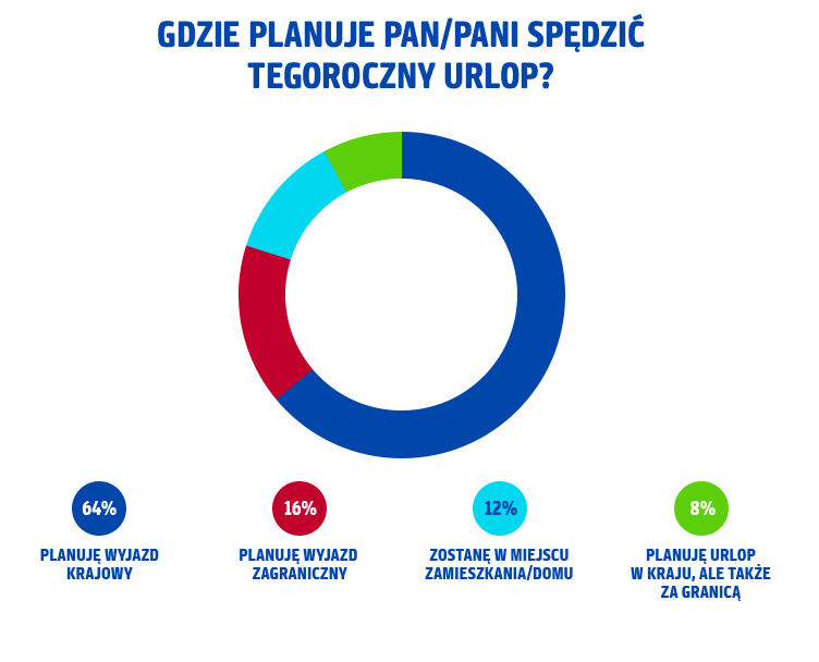 Zdecydowana większość, bo aż 64 proc. respondentów planuje urlop wyjazdowy w Polsce. Za granicę chce wyjechać jedynie 16% ankietowanych, w domu zostanie natomiast 12 proc. osób. Urlop podzielony na wyjazd zarówno w kraju, jak i zagranicę deklaruje 8 proc. respondentów.