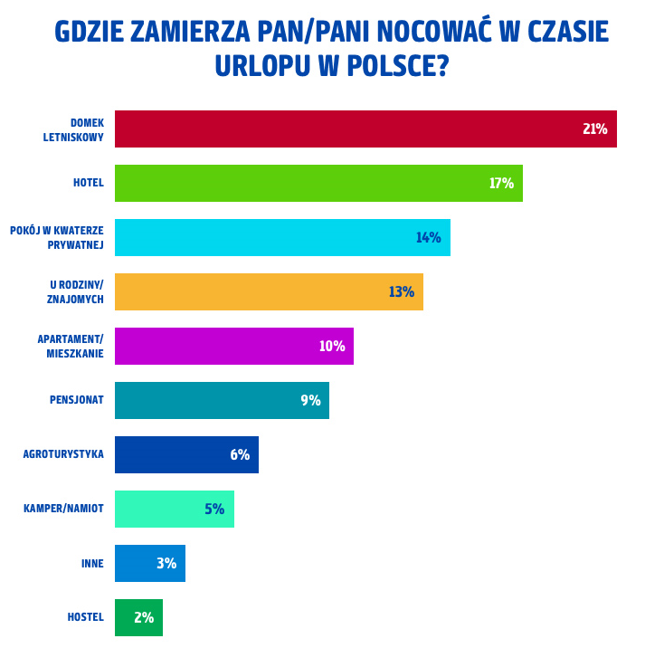 Kluczowym elementem organizacji każdego urlopu są noclegi. To, w jakim miejscu będziemy odpoczywać po dniu spędzonym na zwiedzaniu, plażowaniu lub wędrówkach po górskich szlakach, znacząco wpływa na nasz komfort i zadowolenie z całego wyjazdu. Gdzie zatem śpimy najchętniej? W przypadku noclegów w Polsce nie ma jednego dominującego miejsca – 21 proc. respondentów na czas urlopu rezerwuje domek letniskowy, 17% ankietowanych decyduje się na hotel, a 14 proc. wybiera pokój w kwaterze prywatnej. Zupełnie inaczej sprawa ma się w przypadku wyjazdów zagranicznych, podczas których ponad połowa badanych najchętniej śpi w hotelach.