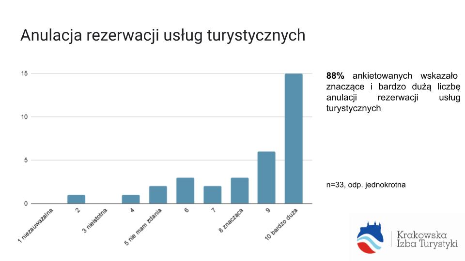 88% ankietowanych wskazało znaczące i bardzo dużą liczbę anulacji rezerwacji usług turystycznych