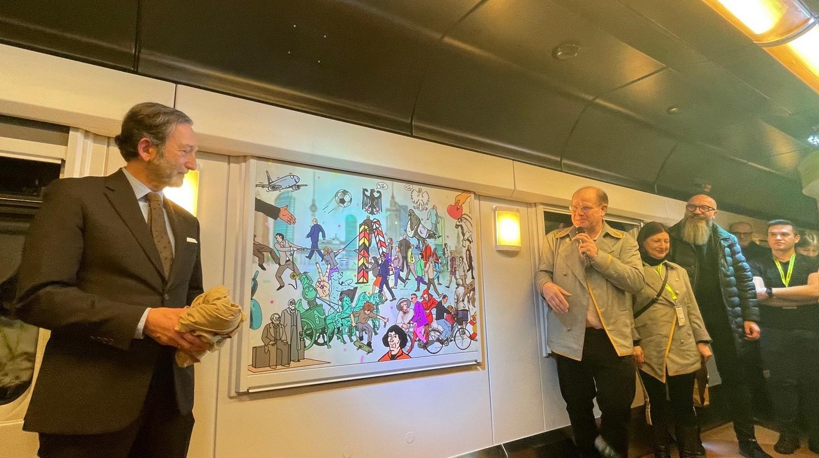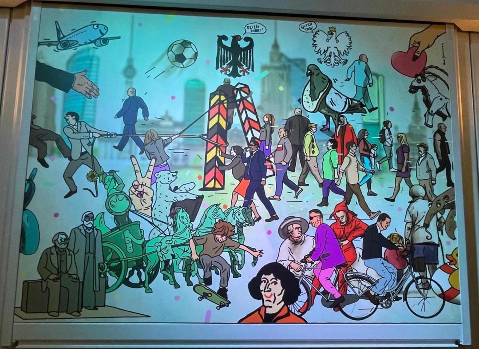 Inauguracji projektu dokonał J.E. Viktor Elbling, Ambasador Republiki Federalnej Niemiec w Polsce. Oznaką tego było odsłonięcie obrazu, który przedstawia wiele osób obu krajów, głównie zwykłych obywateli, ale także wybitne jednostki. Z Polski są to Mikołaj Kopernik i Stańczyk z obrazu Matejki, a z Niemiec Goethe oraz… Marks i Engels. Wśród symboli: orły – polski i niemiecki, Warszawska Syrenka, Pałac Kultury i Nauki, poznański koziołek, Berliński Niedźwiedź oraz czterokonny zaprzęg z Bramy Brandenburskiej.